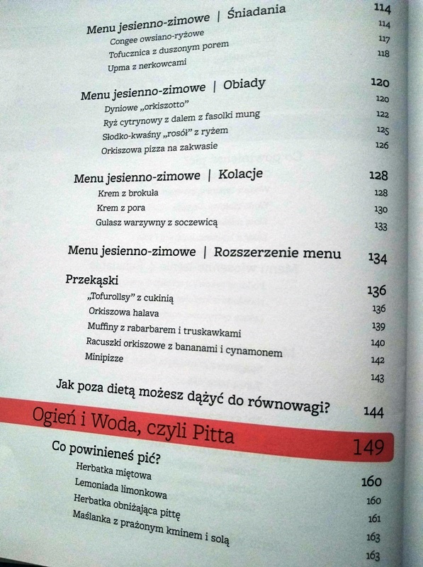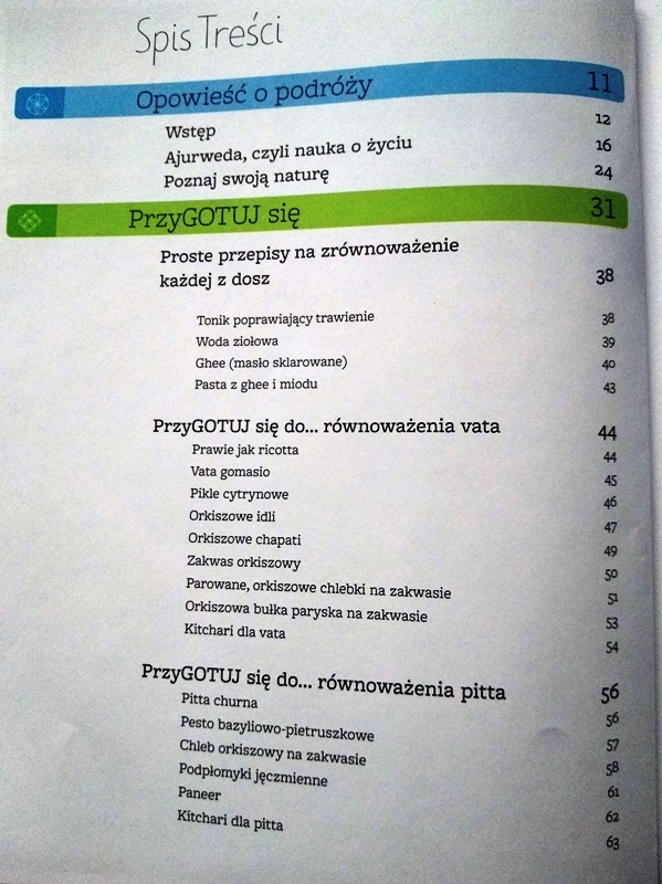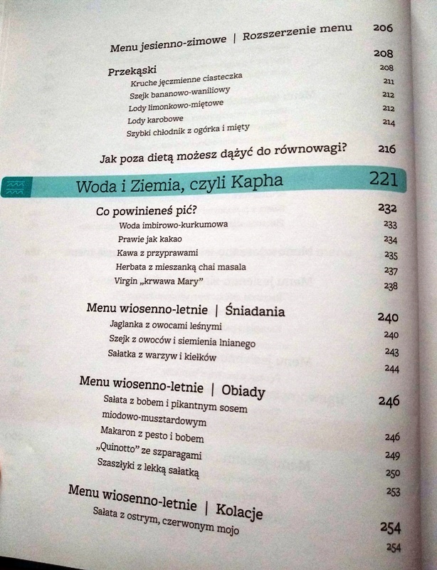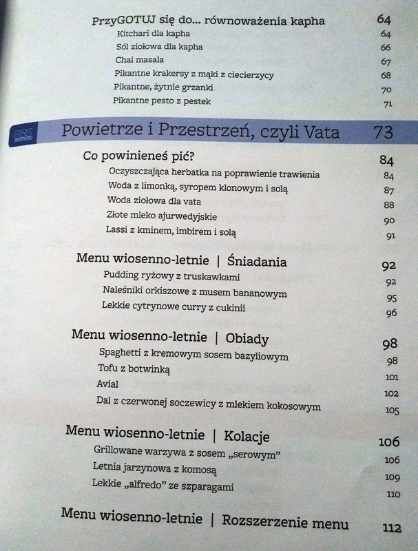 Bardzo podoba mi się część książki poświęcona przygotowaniom, czyli oprócz dawki wiedzy o ajurwedzie, teście do wypełnienia, który wstępnie pozwala uzyskać przybliżoną wiedzę o swojej konstytucji, są też porady jak „wejść” w te zasady. I tak dla przykładu mogę wymienić kilka: płuczmy wszystkie rośliny strączkowe i ziarna, jedzmy owoce tylko do południa, czy ćwiczmy z umiarem. A ponadto w tej części znajdziemy przepisy na to jak własnoręcznie zrobić ghee, albo jeszcze lepiej: pastę z ghee i miodu lub też coś na poprawę trawienia, czyli tonik imbirowy.