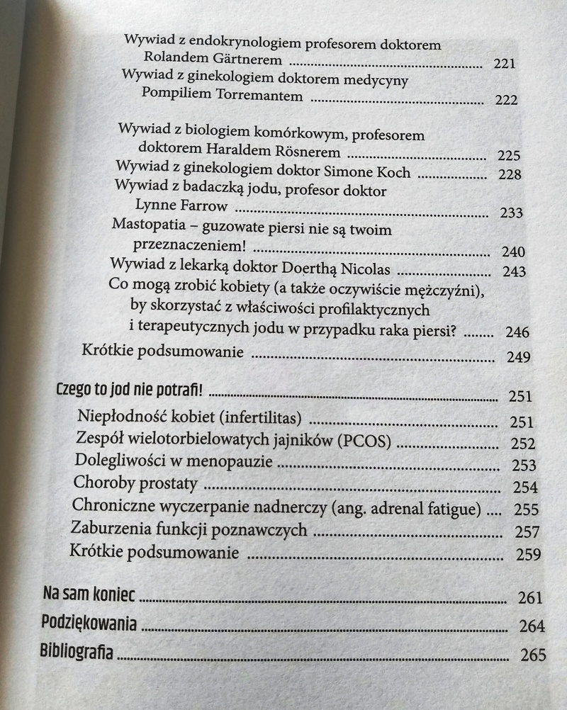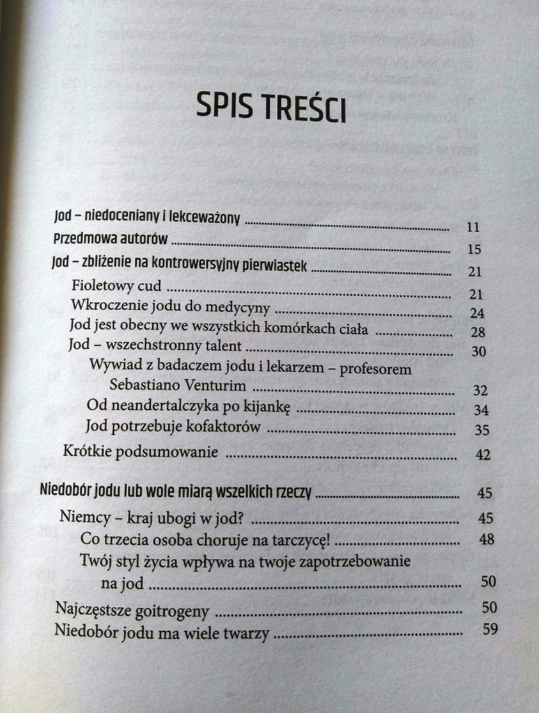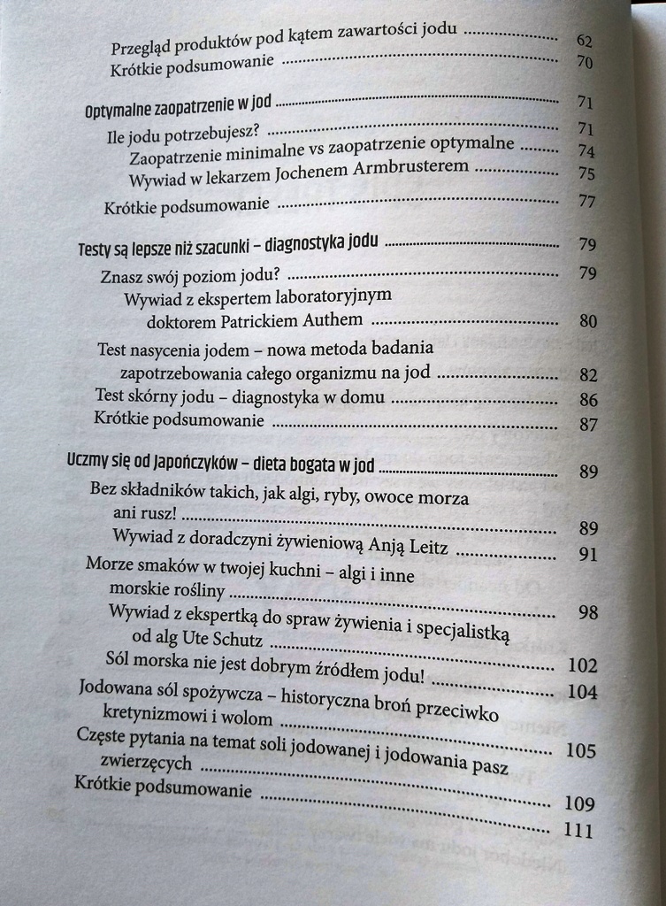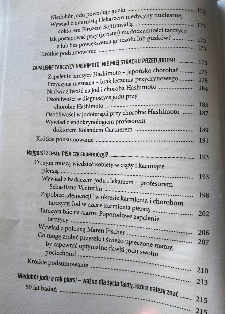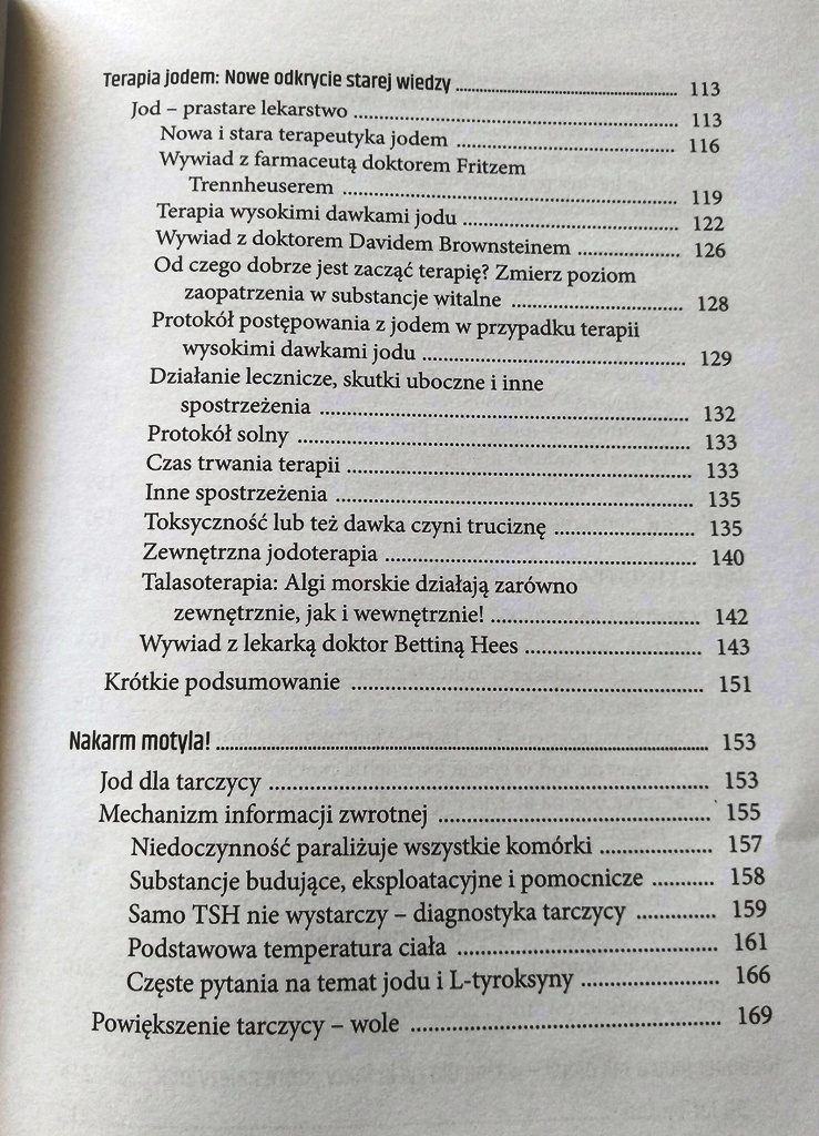 W książce można też poczytać o protokole jodowym, o wpływie jodu na kobiety po porodzie i karmiących piersią i ich otępieniu będącego wynikiem niedoboru jodu, o jego wpływie na tarczycę, a także o Hashimoto, niepłodności kobiet, zespole wielotorbielowatych jajników, dolegliwościach przy menopauzie, chorobach prostaty i innych. A także o wszędobylskim niedoborze jodu, z którym się borykamy, najczęściej totalnie tego nieświadomi.
